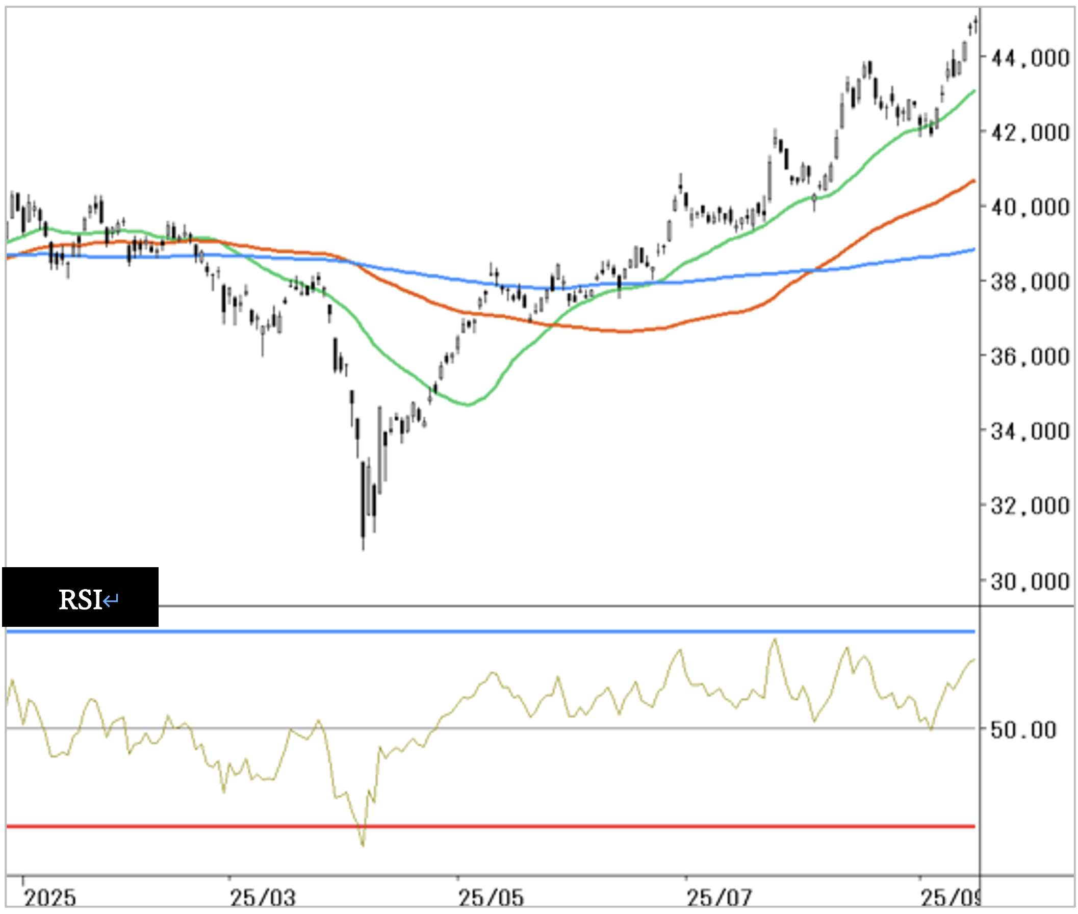 下値は、44000円とそれ以降は各移動平均線がポイントとなります。