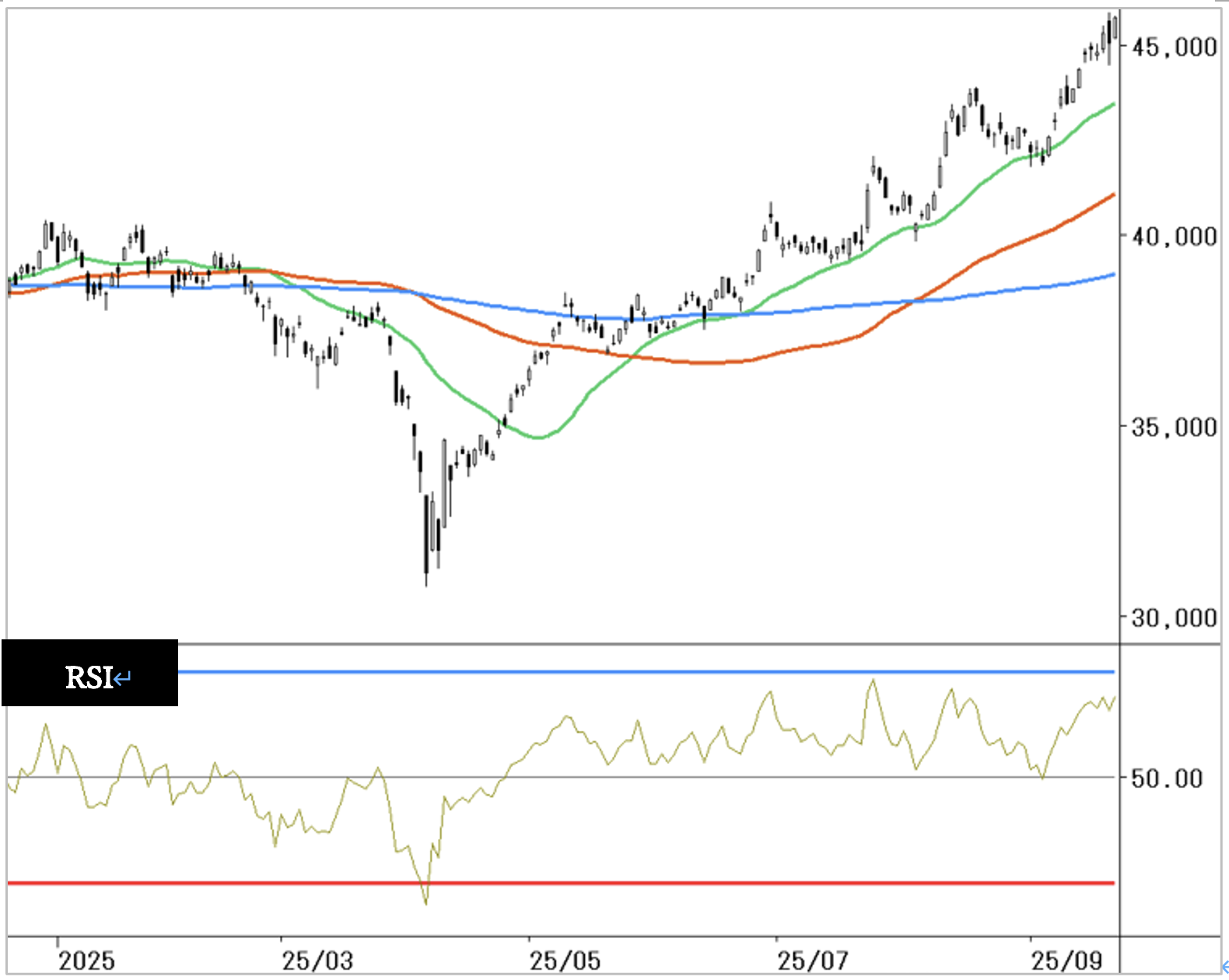 上値は、46000円。