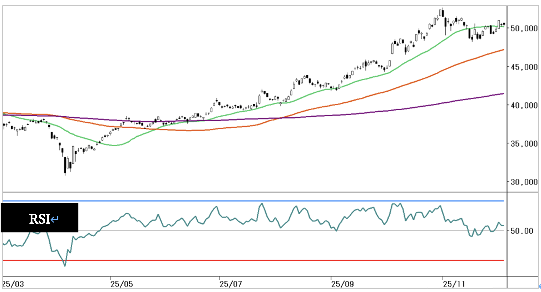 その後は、25日移動平均線および同線が位置する5万円近辺を意識した攻防が続きました。