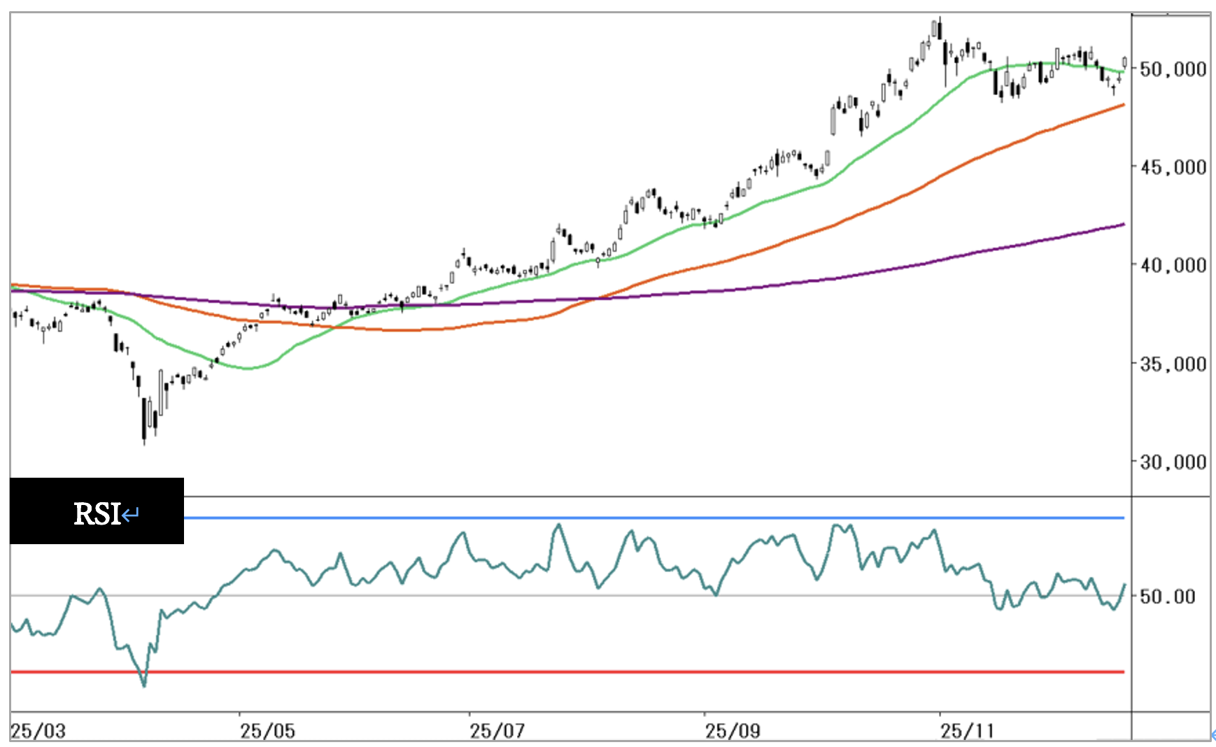 ローソク足が、25日移動平均線を前後にもみ合っている状況です。