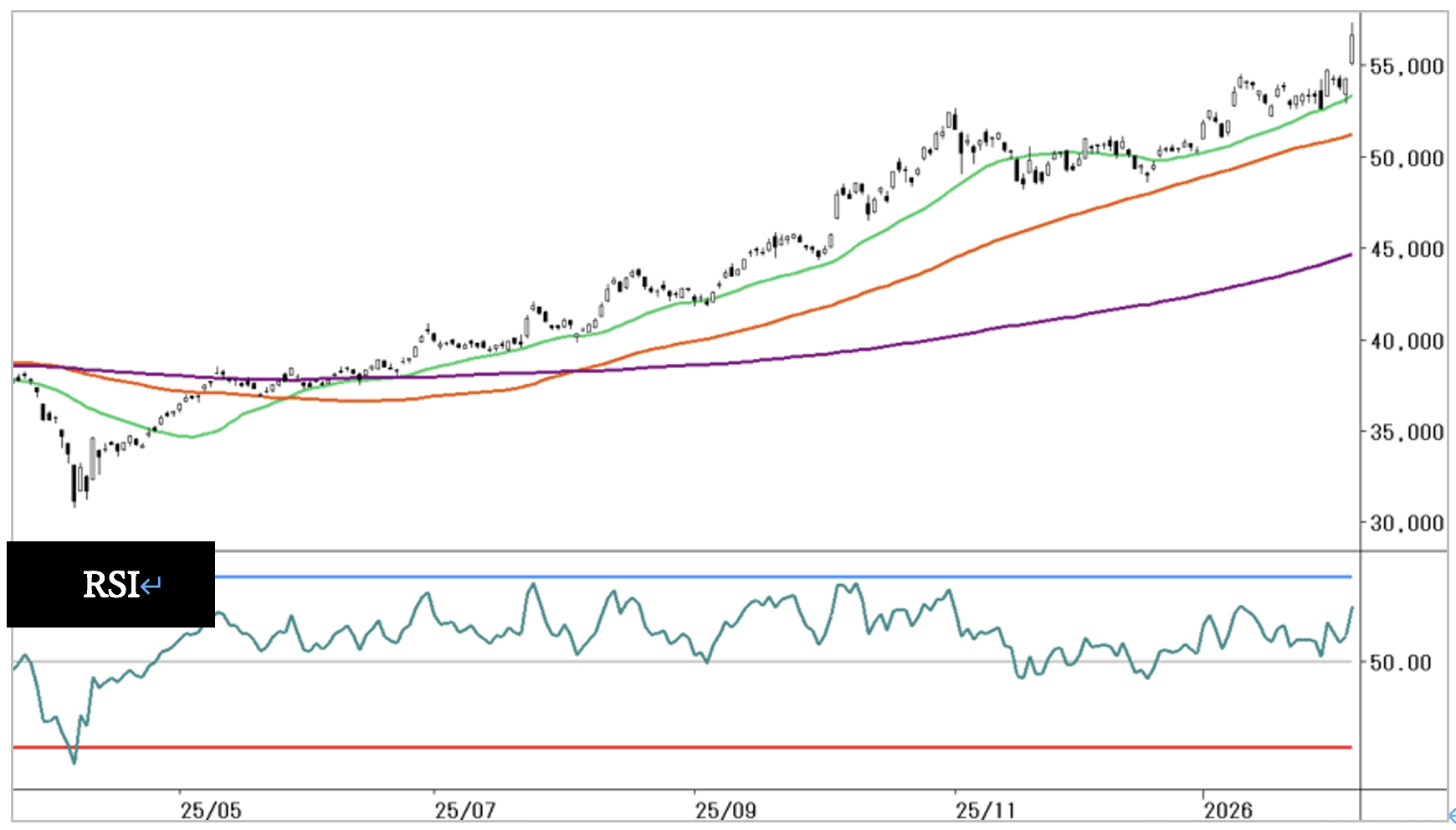 また、衆院選の投開票を直前に控え、政策や政治動向を見極めたいとの様子見姿勢が強まる場面も見られましたが、終値ベースでは週間で上昇を確保しました。先行き不透明感が残る中においても、下値では着実に買いが入り、マーケットの底堅さが改めて示された1週間と評価できます。
